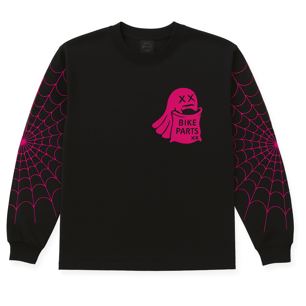 Meet The Halloween Special — a statement piece that blends bold graphics with a ghostly edge. Featuring a hot pink ghost logo reading Bike Parts on the front chest and oversized Vanishing Ones branding across the back, this shirt is built to stand out. The sleeves carry a striking spiderweb design that ties the whole fit together, giving it an unmistakable attitude on and off the bike.